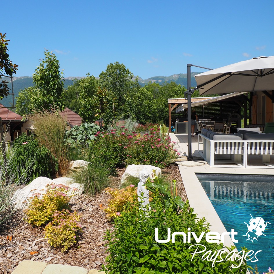 Aménagement paysager Divonne Pays-de-gex Univert Coccinelle piscine terrasse grès cérame abri mur plantations fruitiers arbres fleurs jardin